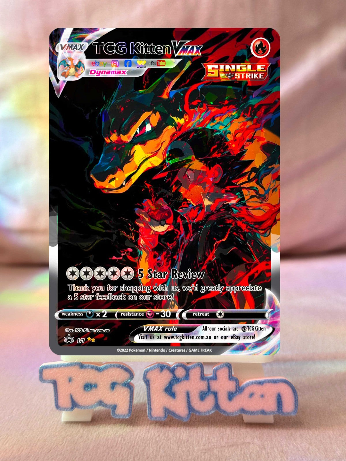 *CUSTOM* Ash & Charizard VMAX Cracked Ice Holo Handmade Proxy Card TCGKITTEN